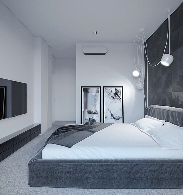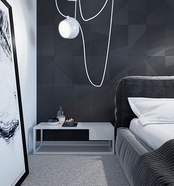 這樣一個大膽和有限的調色板可以使幾乎任何空間感覺簡約,但在這裡,巧妙地使用微妙的紋理有助於睡房保持感興趣和身臨其境的整體。藝術品的巧妙使用通過平滑流暢的線條分解廣角的角度來延續這種對比的做法。大膽的黑色和白色僅通過光線和陰影的效果才達到灰度(除了少數例外,如地毯和繪畫細節)。總的來說,由於豐富的原始白色表面,以抵消黑色的特徵,房間看起來很黑暗,但不會陰沉。