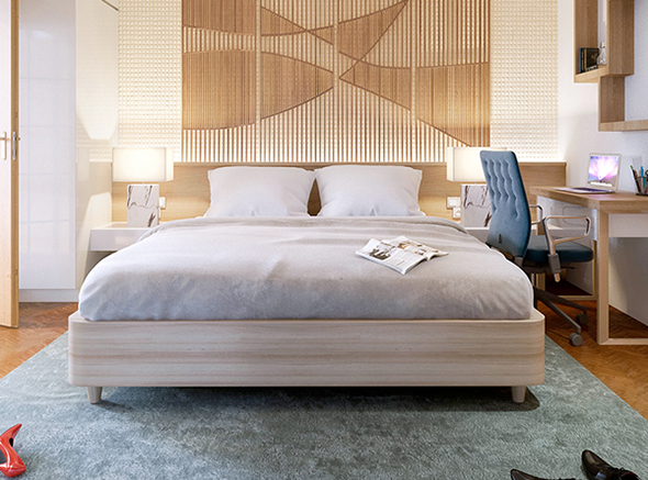 這些特殊的板條與床的基座相匹配,並逐漸變細以滿足由相同木材製成的面板。框架圖片補充了整個外觀。