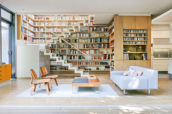 在開放式生活區安裝特別高聳的圖書館的完美場所必須在樓梯周圍。上升的踏板提供了完美的爬升到知識樹的頂部,允許在每個架子上停下來。如果您在家裡的樓梯是更傳統的品種和空間是非常寶貴的,那麼您仍然可以利用它下面的未使用的空間來收集書本。
